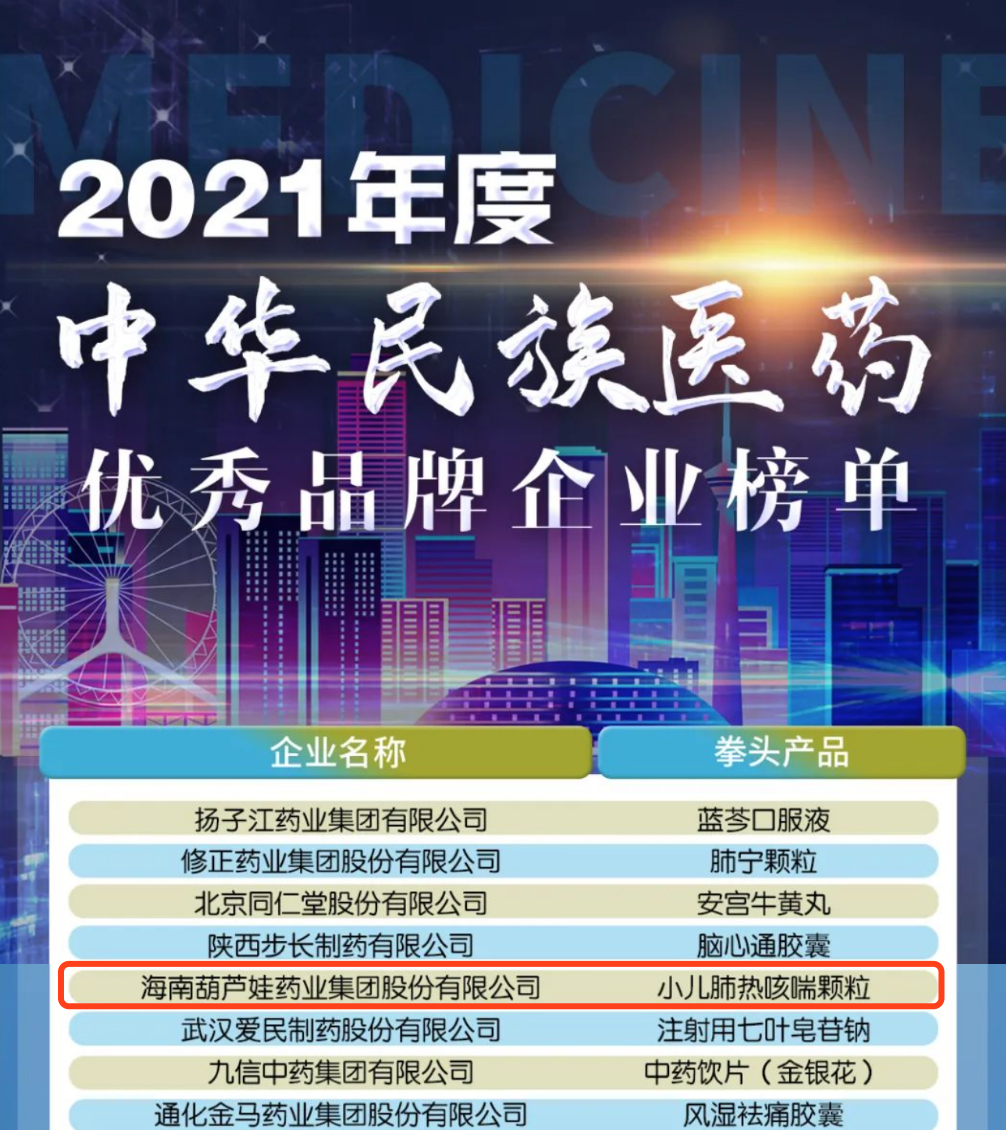12月29日,全国工商联医药业商会发布了“2021年度中华民族医药优秀品牌企业榜单”,AG贵宾药业集团凭借黄金单品小儿肺热咳喘颗粒(4克)实力登榜。